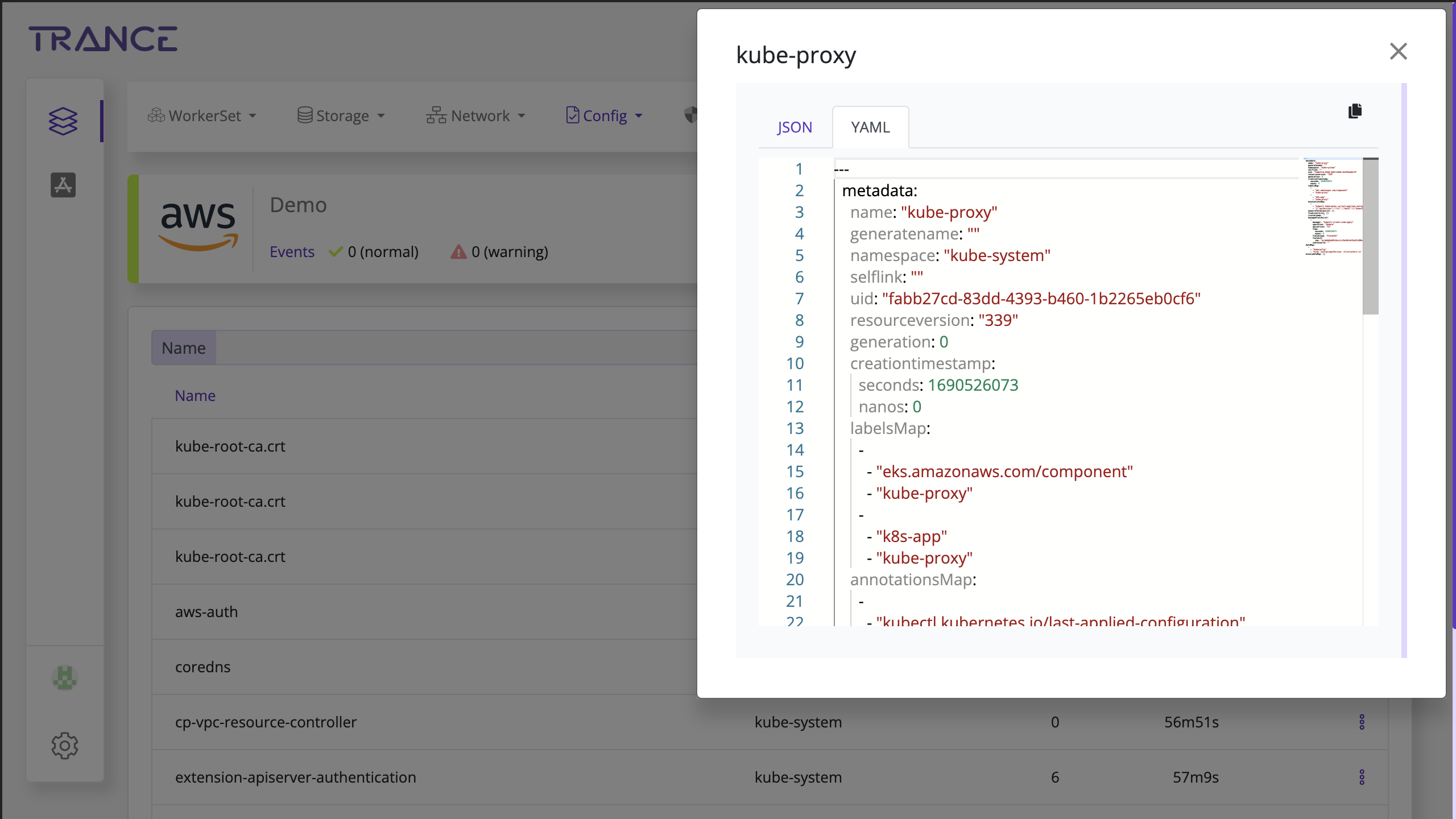 - Detailed view of the YAML of JSON can be viewed on Trance