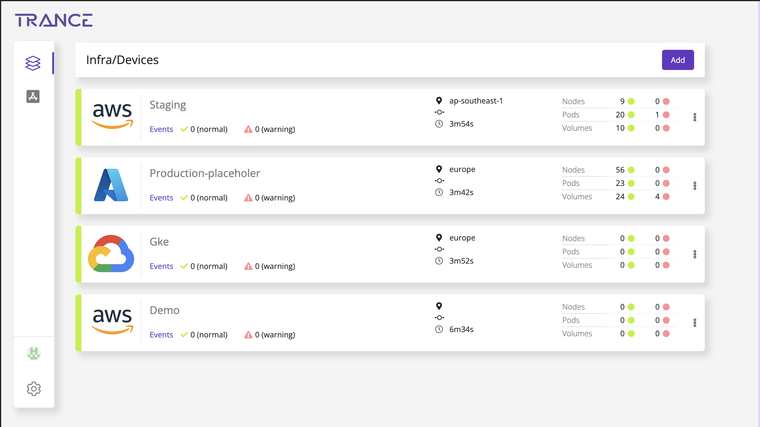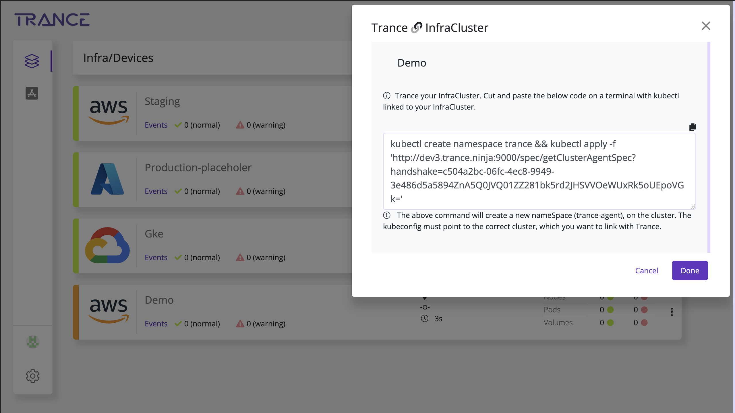 Clusters can either be provisioned using Trance. Existing clusters managed on other cloud platforms can be managed using Trance, by linking same with Trance.1