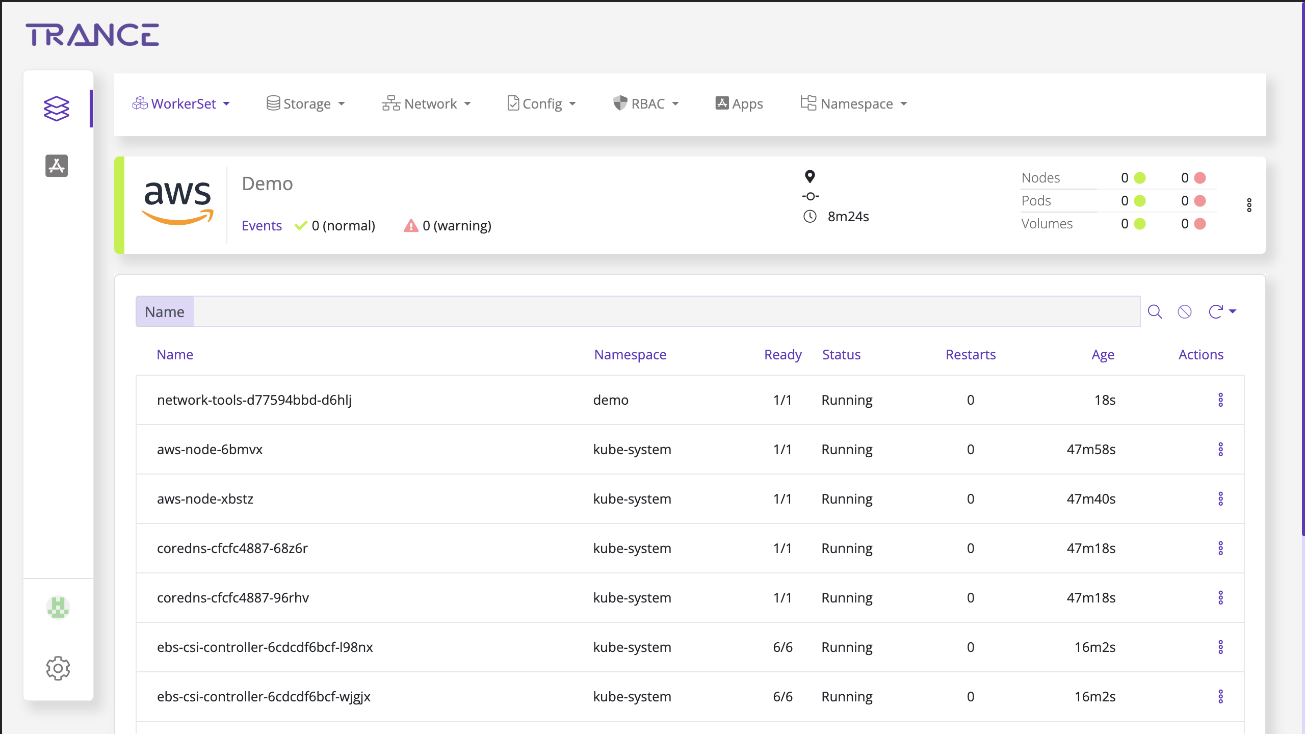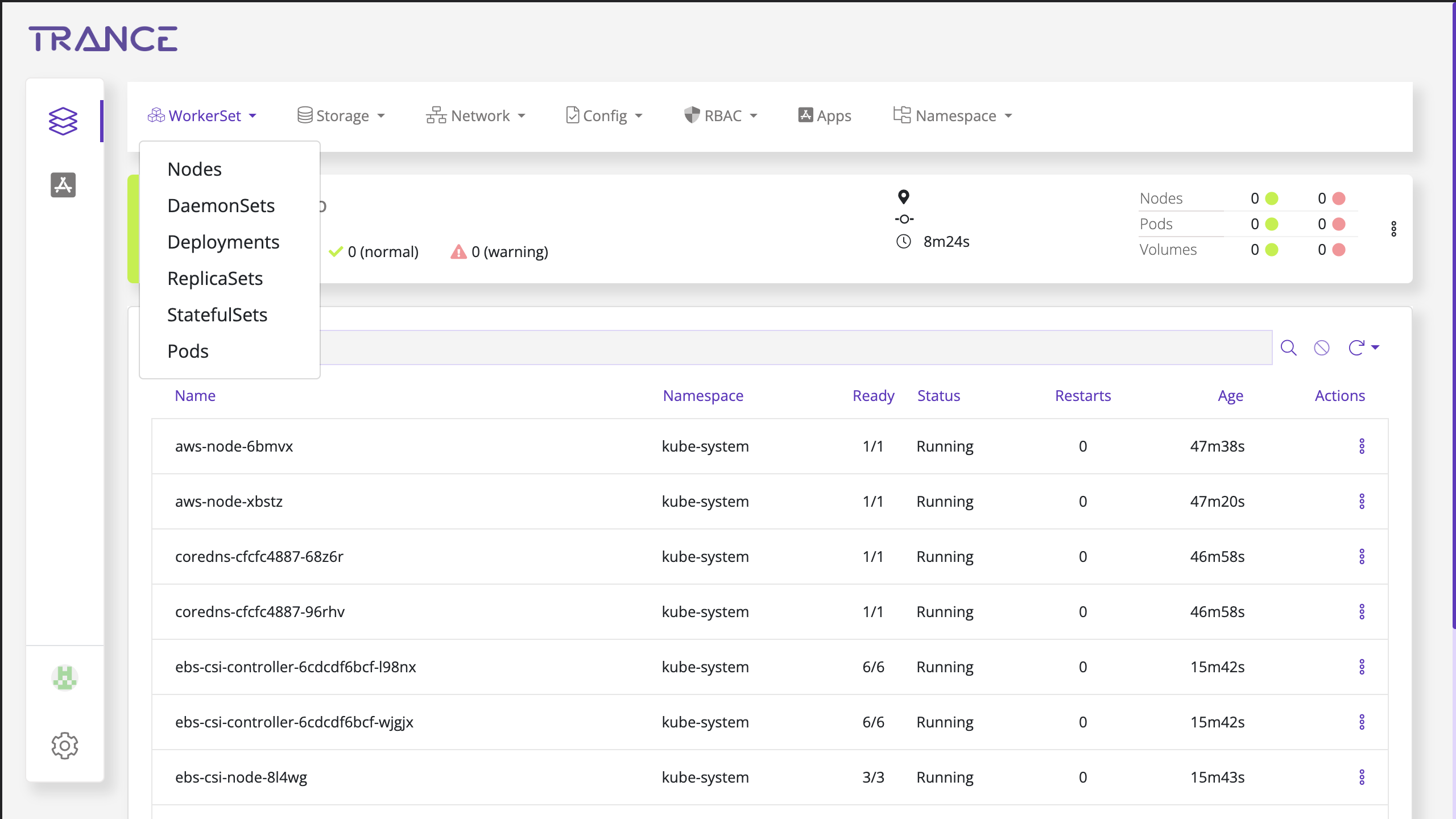 Pods can be viewed per namespace. Pod status and uptime can be viewed on the pod listing page.